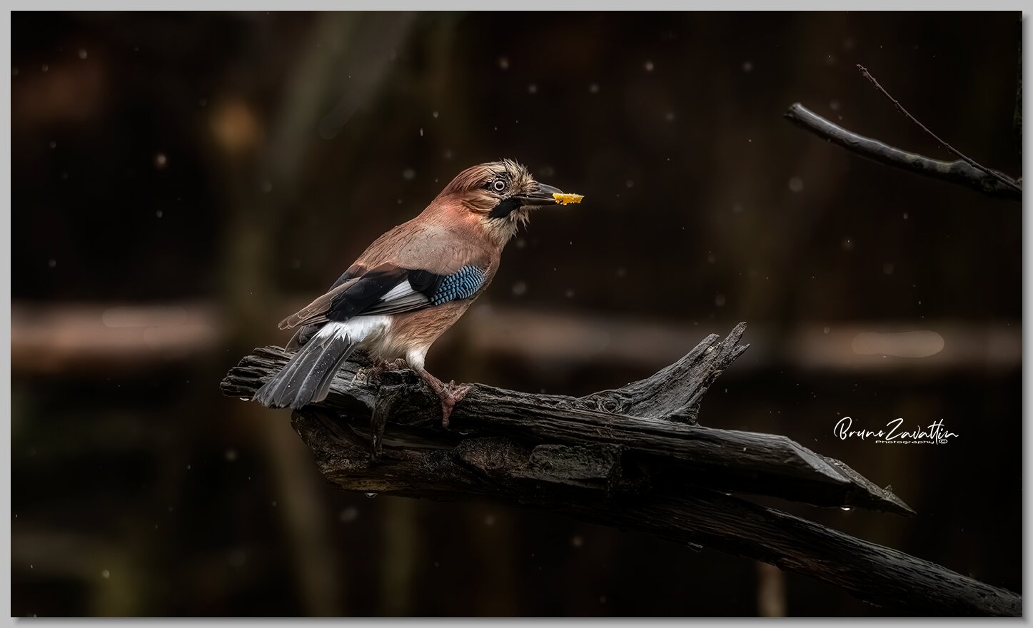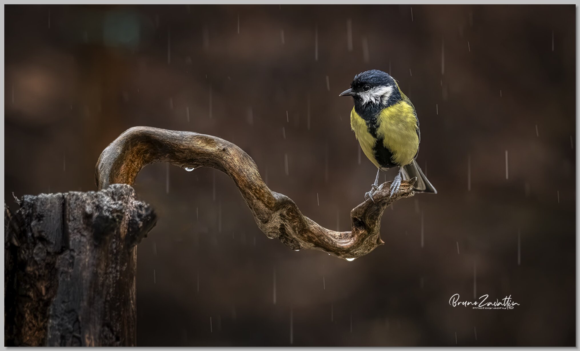 Cinciallegra tronco contorto pioggia